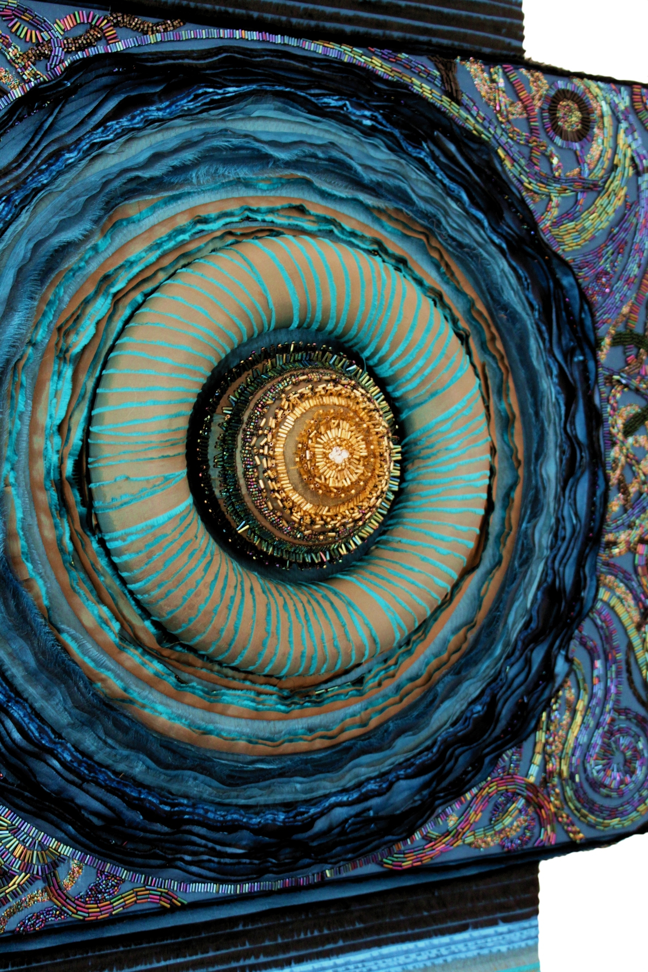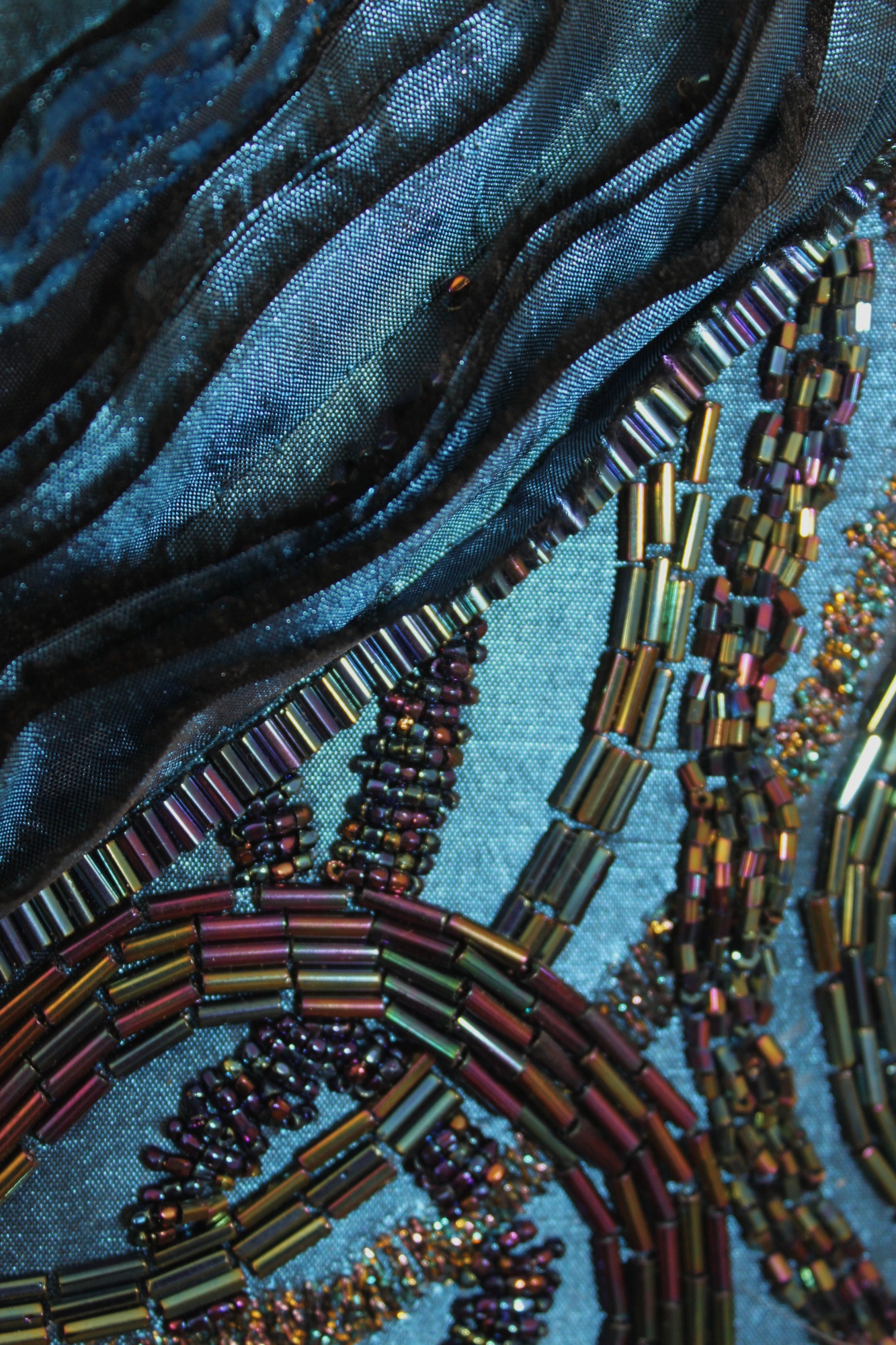 The high-relief composite panel is created with strips of varied fabrics hand-couched onto fabric-covered supports.Rich detail is created with iridescent bead-embroidery
